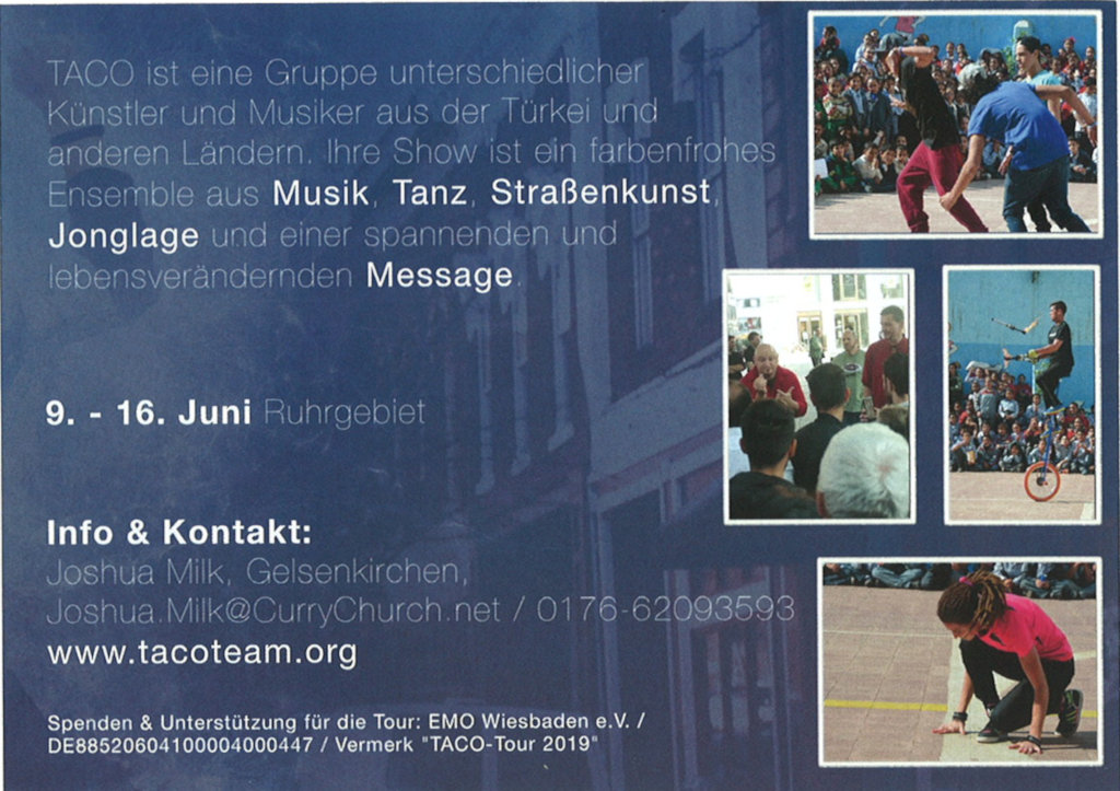Das TacoTeam ist eine Gruppe unterschiedlicher Künstler und Musiker aus der Türkei und anderen Ländern. Ihre Show ist ein farbenfrohes Ensemble aus Musik, Tanz, Straßenkunst, Jonglage und einer spannenden und lebensverändernden Message. Ein anspruchvolles Event, gerade auch für unsere fremdsprachigen Freunde!