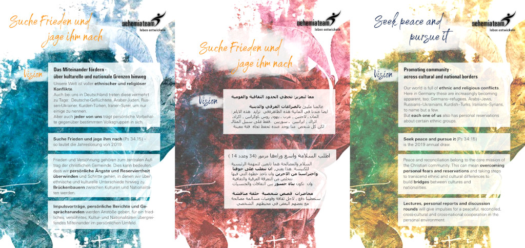 Unser Land wird interkultureller. Nicht nur die verschiedenen Volksgruppen haben Schwierigkeiten untereinander – auch wir pflegen Vorbehalte. Suche Frieden und jage ihm nach! Die Jahreslosung ist Herausforderung und Chance zugleich. Wenn wir aufgefordert werden, ihm nachzujagen, besteht wohl die Möglichkeit, ihn zu erreichen…