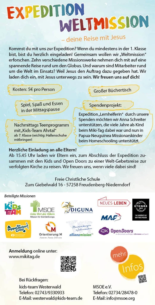 MiKiTag – das ist der Missions-Kinder-Tag. Viele Veranstaltungen rund um das Thema Mission sind häufig auf Erwachsene ausgerichtet. Der MiKiTag ist für Kinder und Jugendliche: Sie erfahren, was es mit Mission und christlichem Engagement auf sich hat. Wie es Kindern in und aus anderen Ländern geht und was sie für sie tun können. Auch Spiel, Spaß und Action kommen nicht zu kurz!