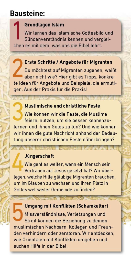 Unsere Workshops: Grundlagen des – Islam – Erste Schritte / Angebote für Migranten – Muslimische und christliche Feste – Jüngerschaft – Umgang mit Konflikten