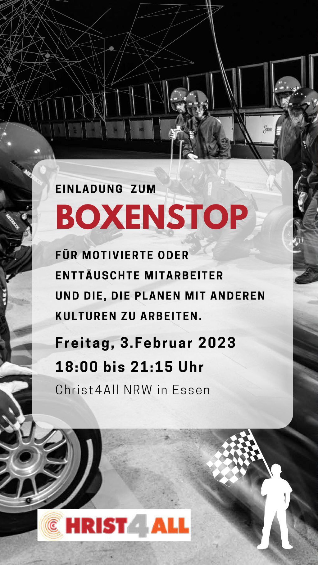 Boxenstopp: Ein Abend, um neu aufgefüllt und ausgerichtet zu werden. Das eigene Herz ermutigen. Hilfreiche Werkzeuge für die Arbeit kennenlernen. …