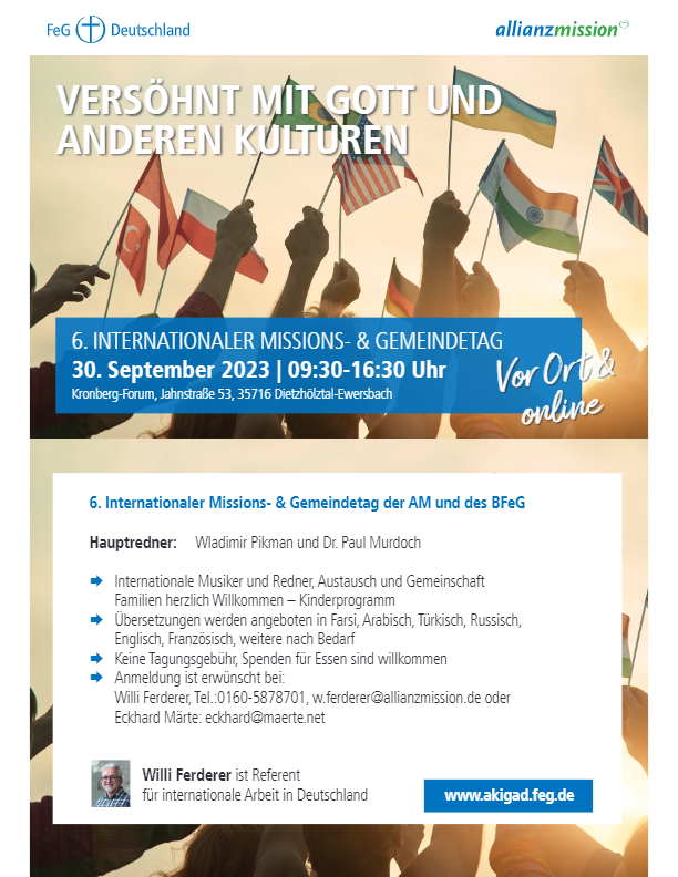 WeiterlesenVERSÖHNT MIT GOTT UND ANDEREN KULTUREN lautet das Thema von dem diesjährigen Missions- und Gemeinetag. Hauptredner: Wladimir Pikmann und Dr. Paul Murdoch Internationale Musiker…