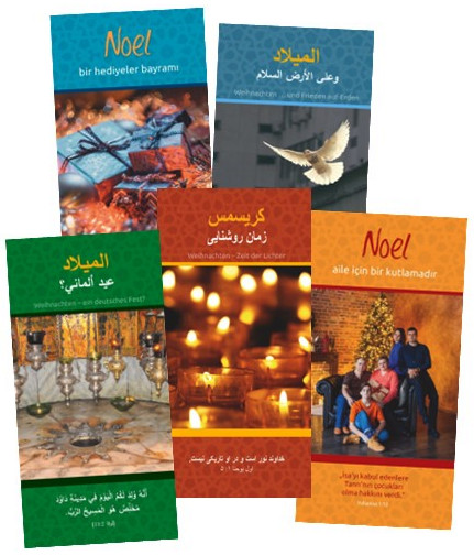Um einen leichten Einstieg für eine erste Begegnung zu schaffen, haben wir, gemeinsam mit dem Evangelischen Salam-Center (Stuttgart), bilinguale Weihnachtskarten in Arabisch-Deutsch, Persisch-Deutsch und Türkisch-Deutsch gedruckt. Die fünf Motive greifen folgende Themen auf: